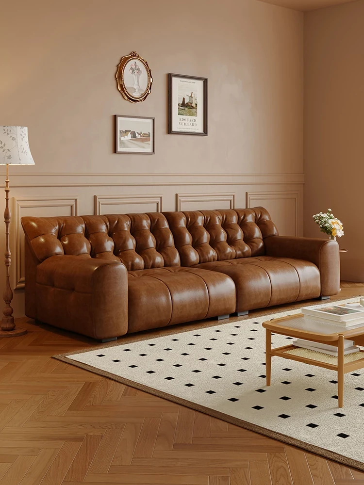 Vintage French Style Waxed Leather Cloud Sofa – Retro Brown Cloud Sofa for Small Living Rooms – Perfect for Cozy Spaces with a Touch of Elegance