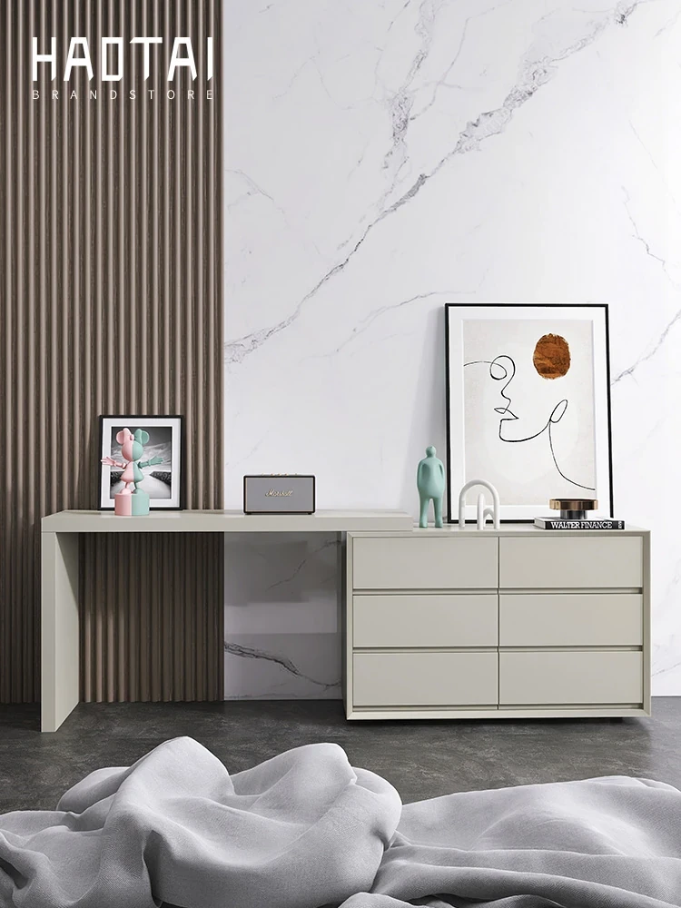 現代的な無垢材使用!焼き付け塗装仕上げのイタリアンスタイル化粧台とデスクのコンビネーション。多機能なコンピューターデスク、サイドキャビネット、伸縮可能なデザインで、寝室にもぴったり!