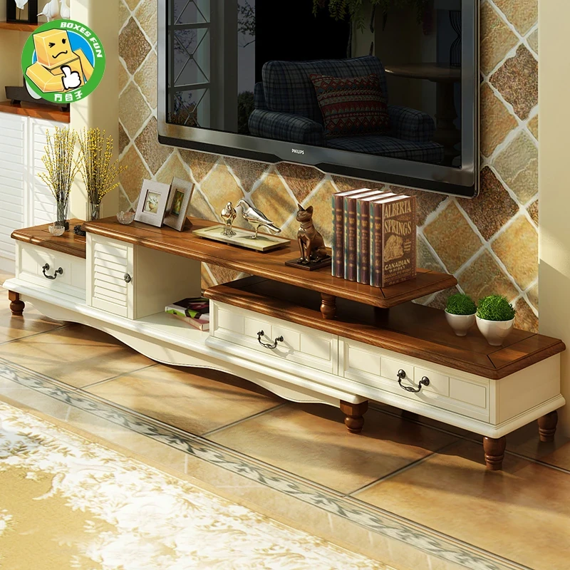 伸縮可能なアメリカンカントリー風テレビ台とコーヒーテーブルのセット - 天然木製、地中海スタイル、小さなリビングルームにもぴったりな高級感あふれる光沢仕上げの収納家具。