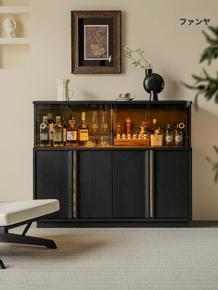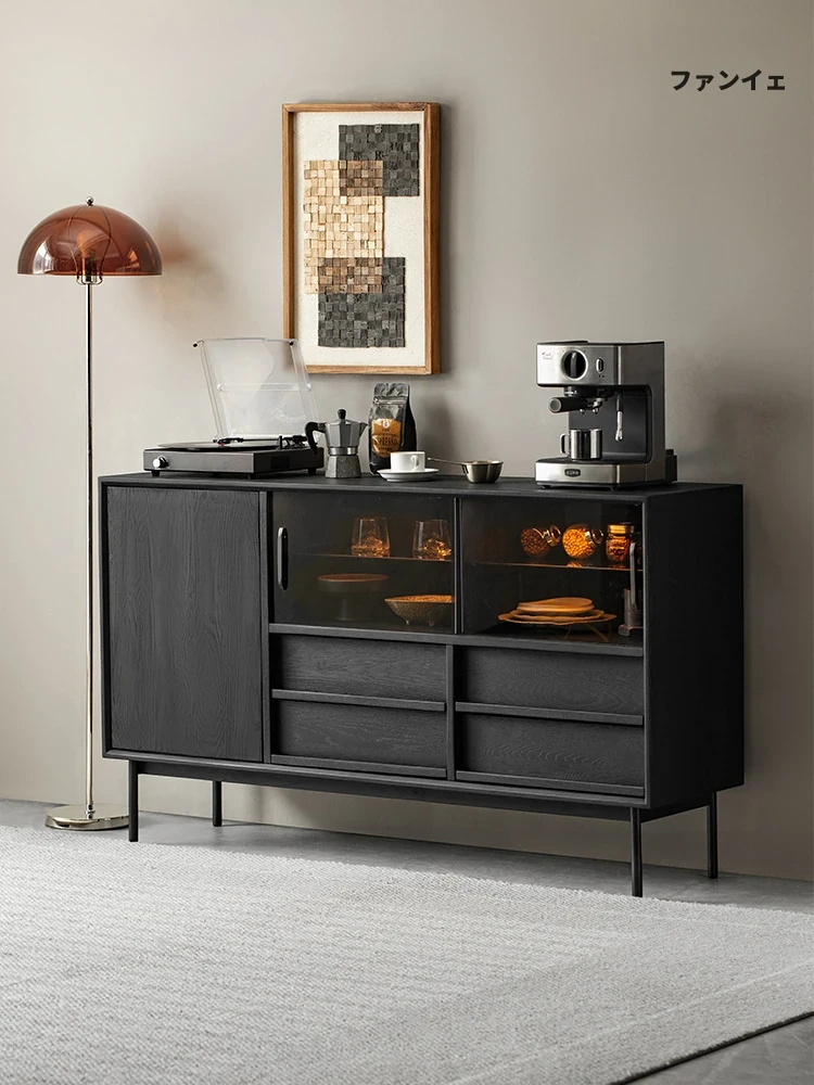 ヴァンヤ家具の潤和ダイニングサイドボード - ブラック無垢材使用のシンプルなリビングコーヒーキャビネット&バーキャビネット、玄関のディスプレイキャビネットとしても最適な収納ソリューション!