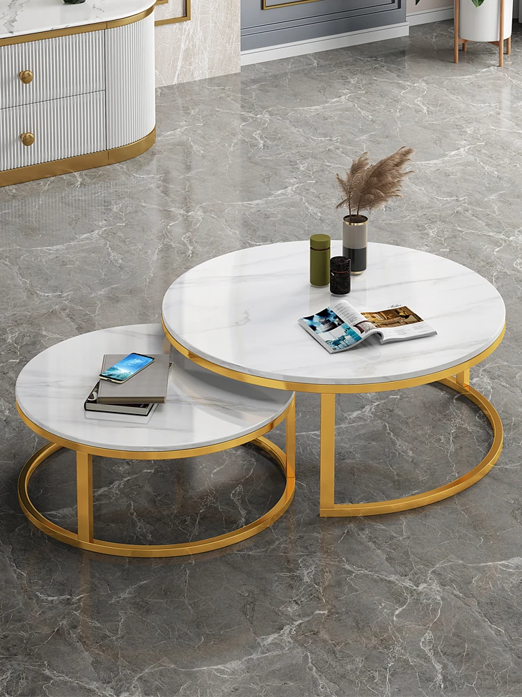 イタリアン・ラグジュアリー風の丸型岩板コーヒーテーブル - モダンでミニマリストなデザイン、小型アパートやデュプレックスに最適な金属製リビング用茶台。洗練されたスタイルでおしゃれな空間を演出!