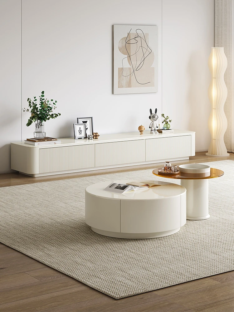新作!軽やかでおしゃれなクリーム風リビング用テレビボード&コーヒーテーブルセット。小型アパートにもぴったりのミニマリストデザイン!お部屋を一新し、センスを引き立てるアイテムです。