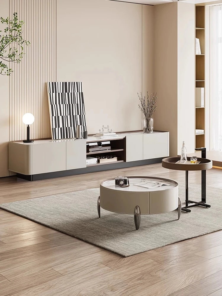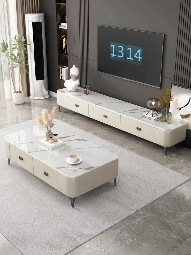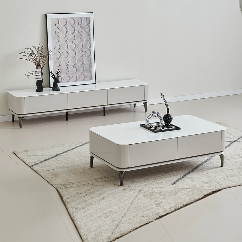 イタリアンミニマリズムの光沢のあるロックプレート製コーヒーテーブル&テレビキャビネットセット - モダンでシンプルなデザイン、広々とした収納スペースを備えたリビングルームに最適!