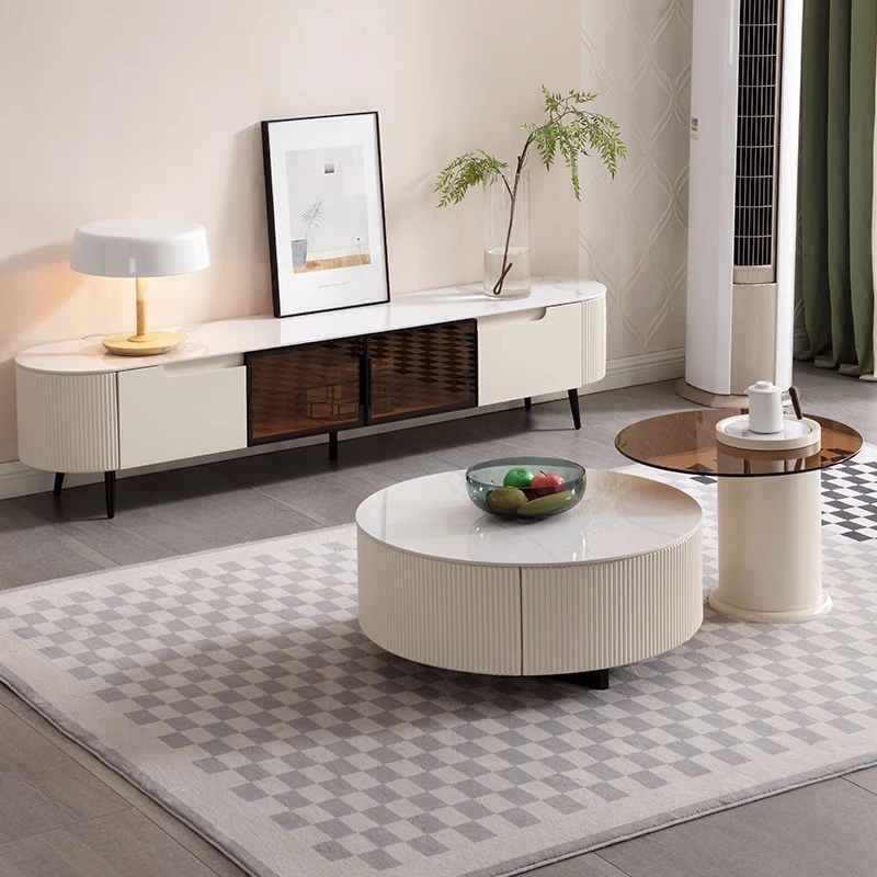 現代ミニマリストスタイルの超クリスタル石製テレビボード&コーヒーテーブルセット - 静音自吸機能付き、多収納デザインで小さなリビングルームに最適!