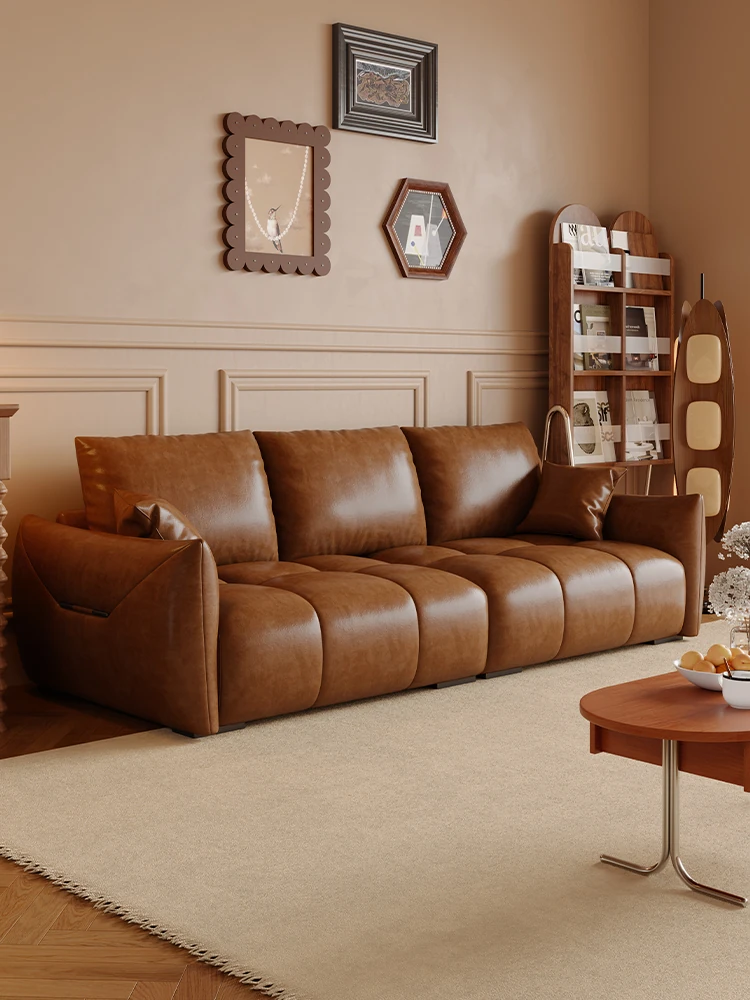 2025 New Vintage Waxed Leather Cloud Sofa - Stylish Brown High-legged Black Sugar Sofa for Small Living Rooms and Retro Home Decor