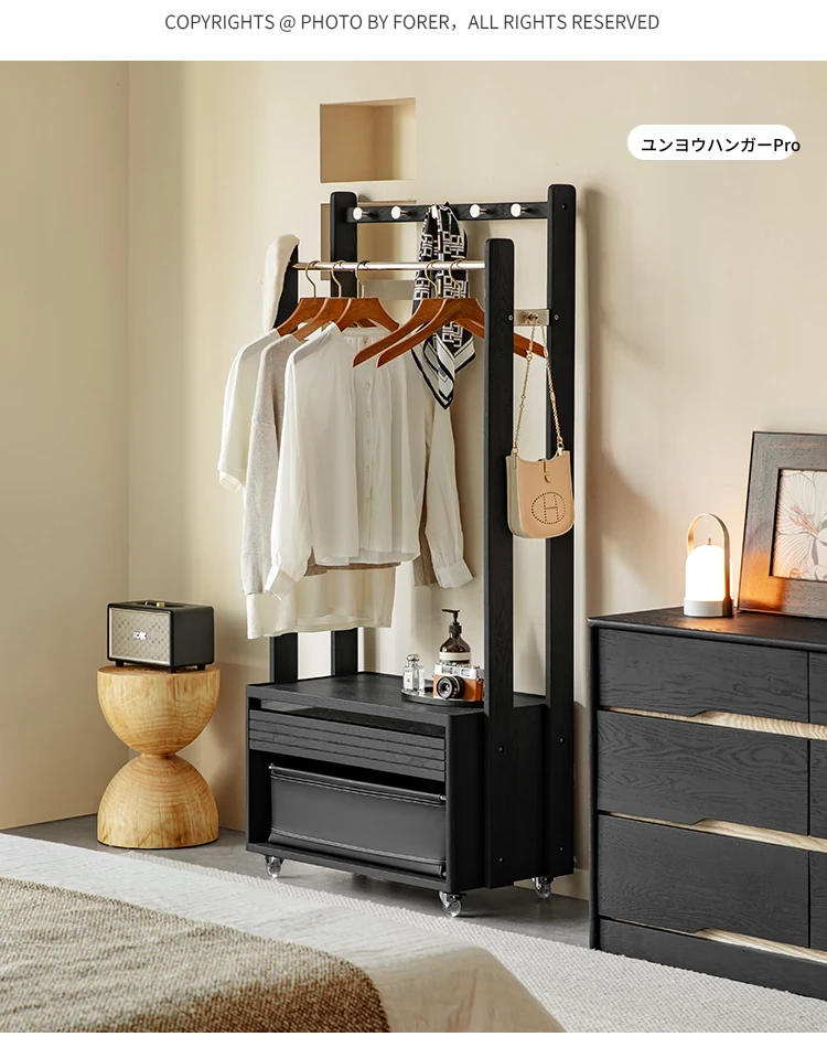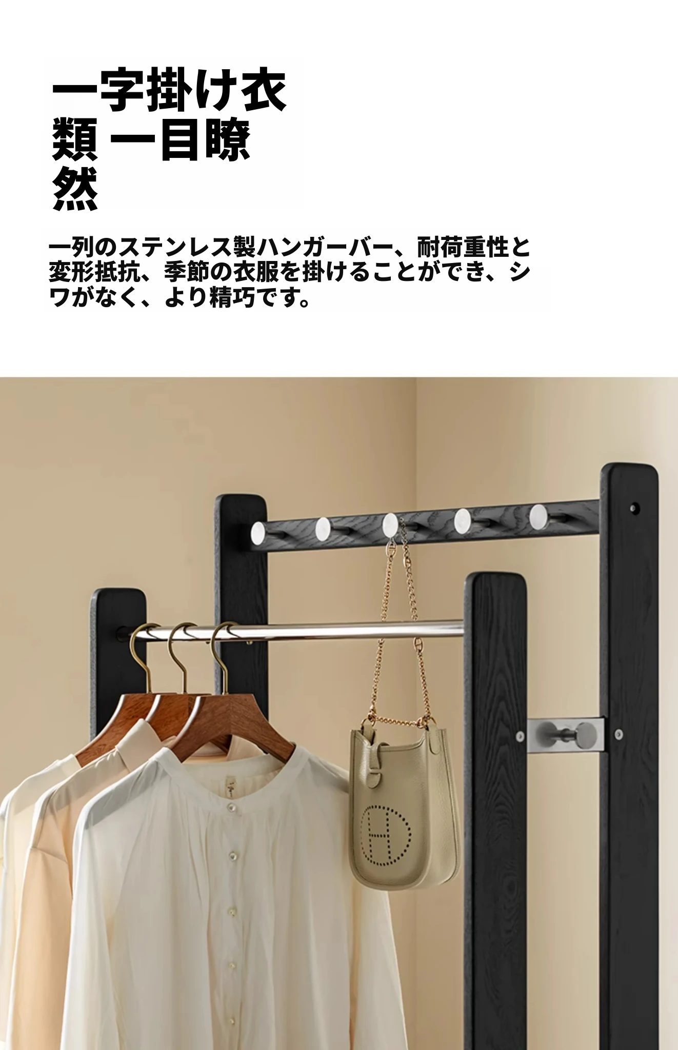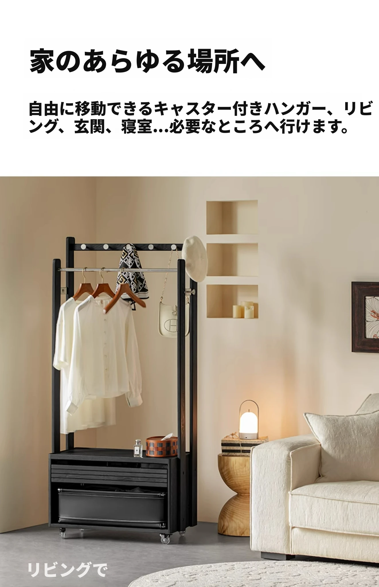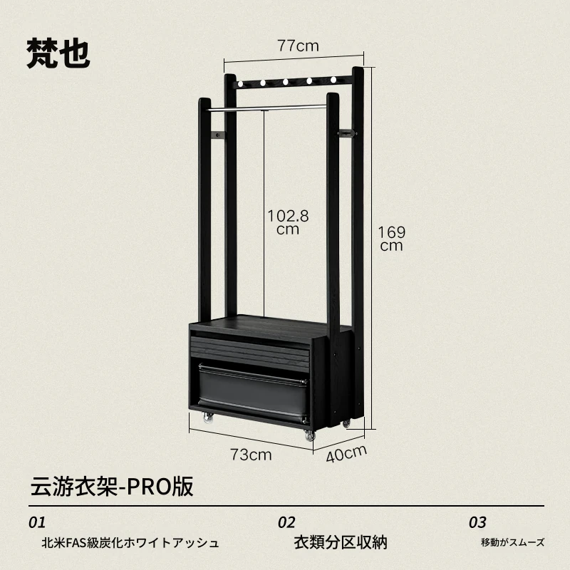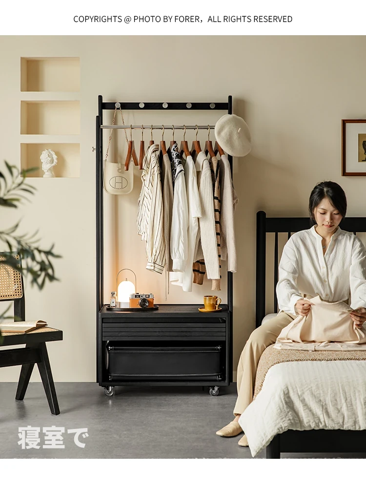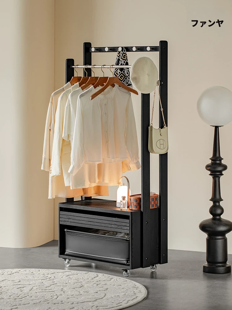 梵也家具のモバイル多機能収納ラック - おしゃれな黒の無垢材製、寝室に最適な衣類・帽子掛け!使い勝手抜群で、どんなインテリアにもマッチします。スタイリッシュな空間を演出しましょう!