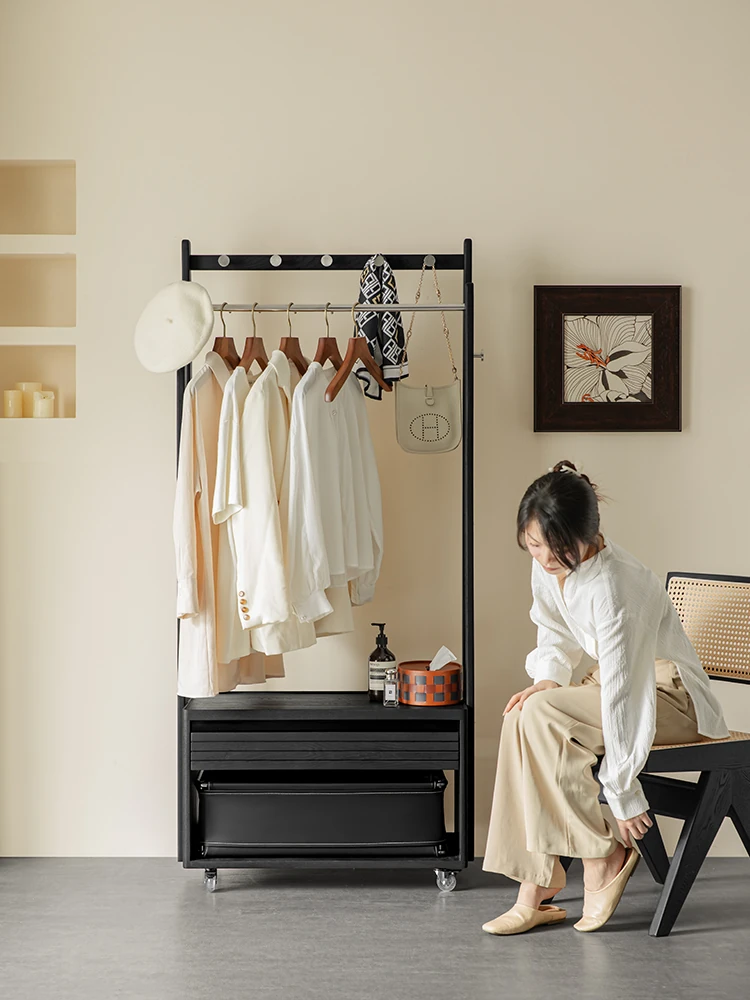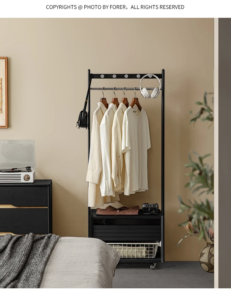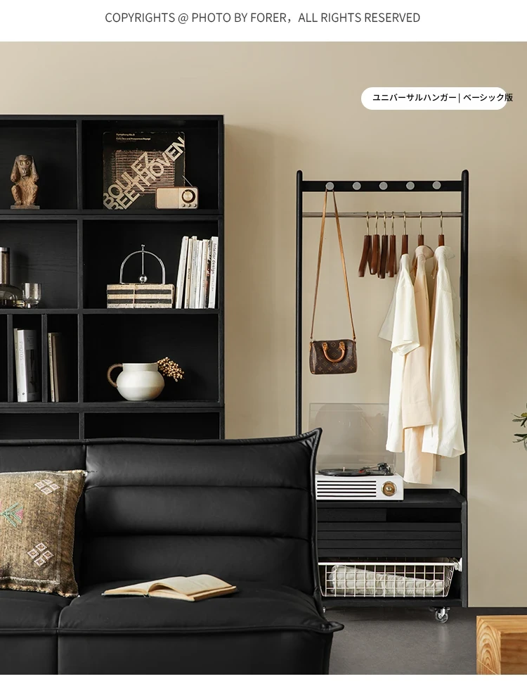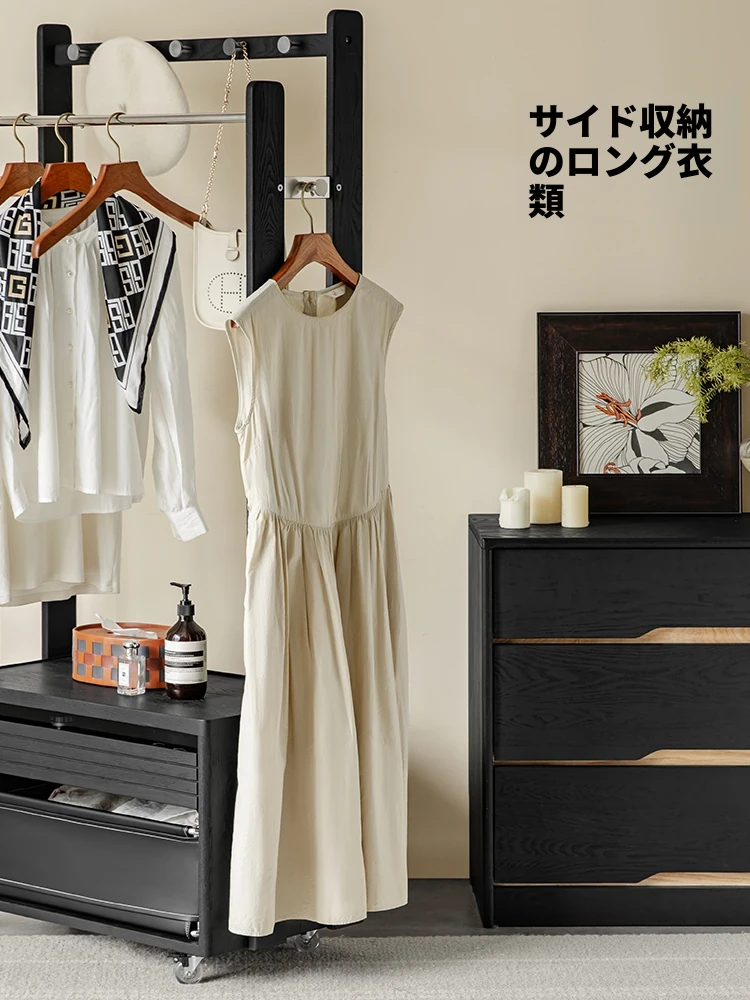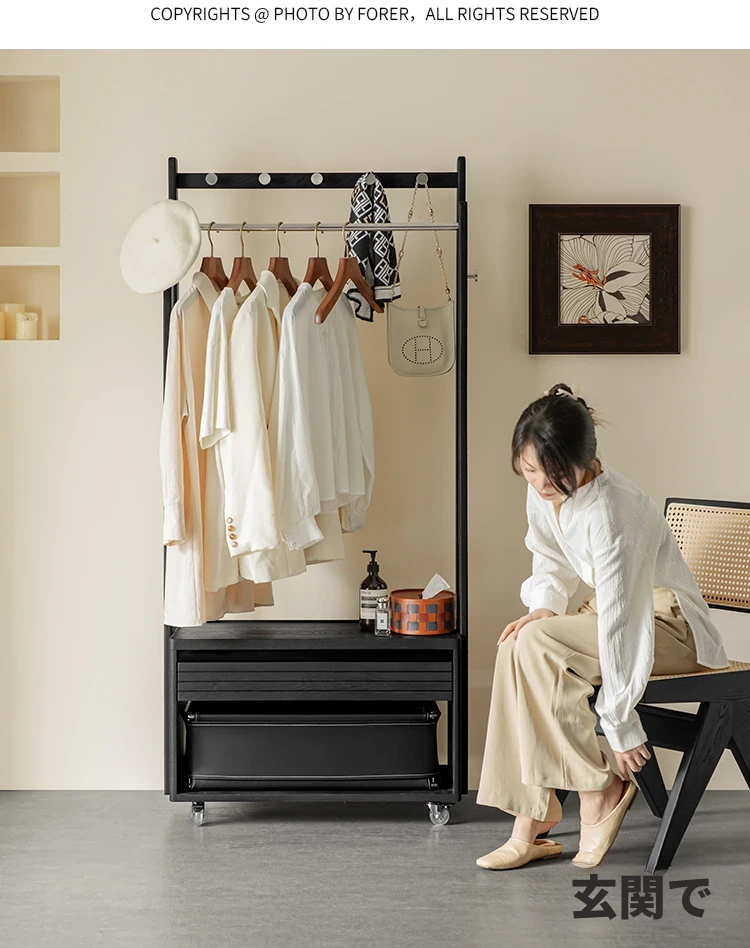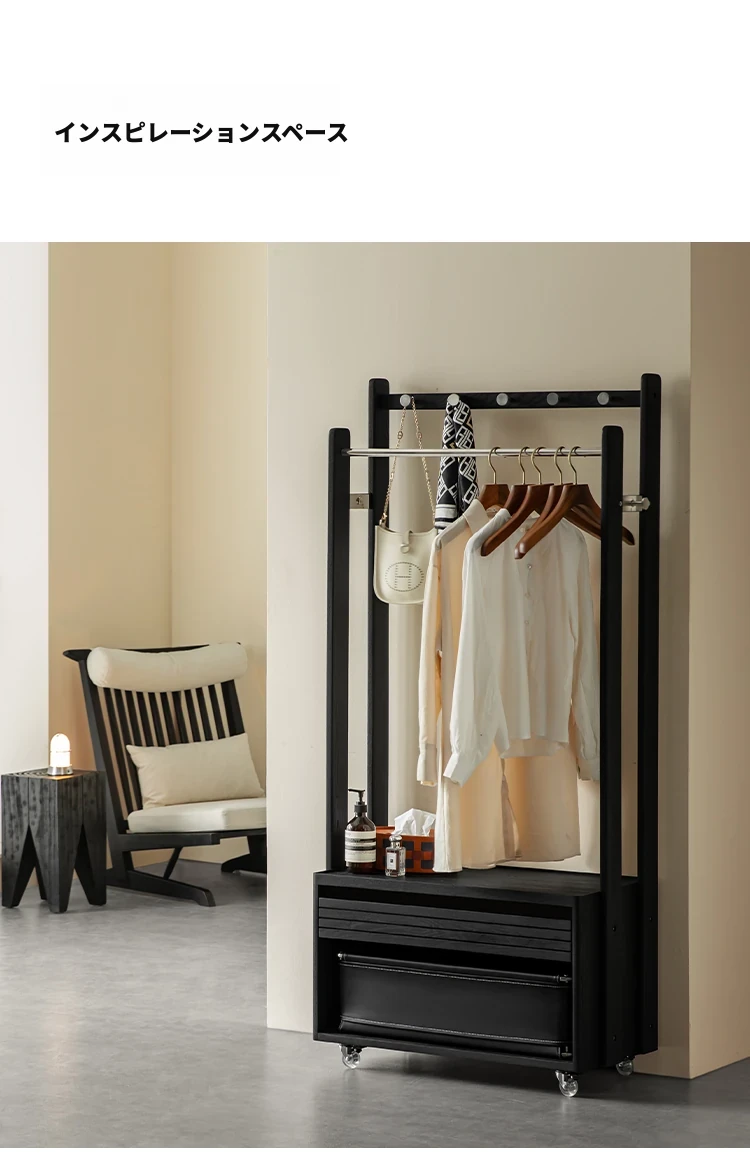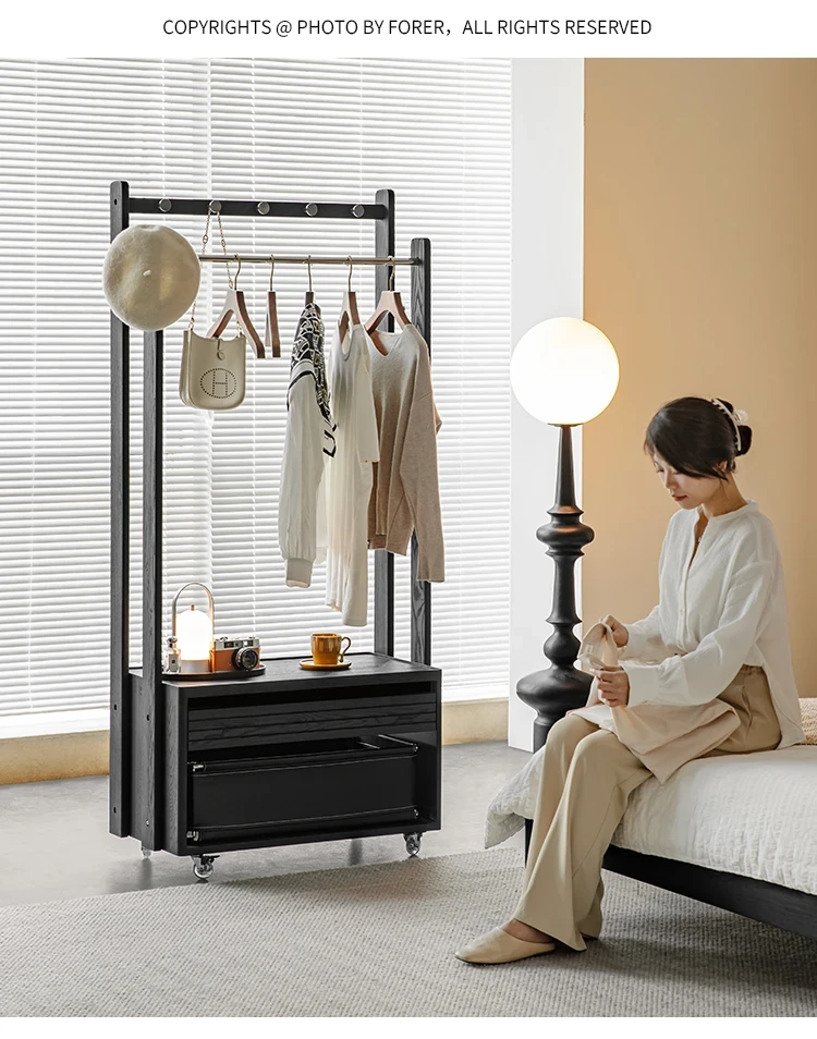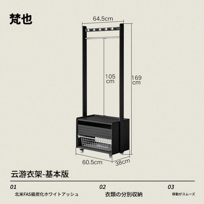 梵也家具のモバイル多機能収納ラック - おしゃれな黒の無垢材製、寝室に最適な衣類・帽子掛け!使い勝手抜群で、どんなインテリアにもマッチします。スタイリッシュな空間を演出しましょう!
