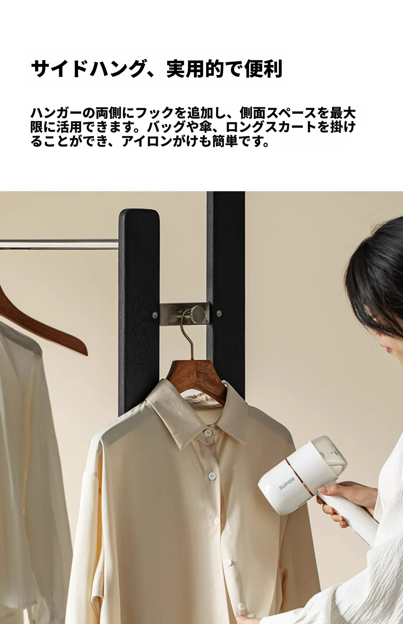 バンヤ家具のユニバーサルコートハンガーPro - ブラックの無垢材製、寝室にぴったりな移動式衣類収納ラック。スタイリッシュで実用的、あなたのインテリアを引き立てます!