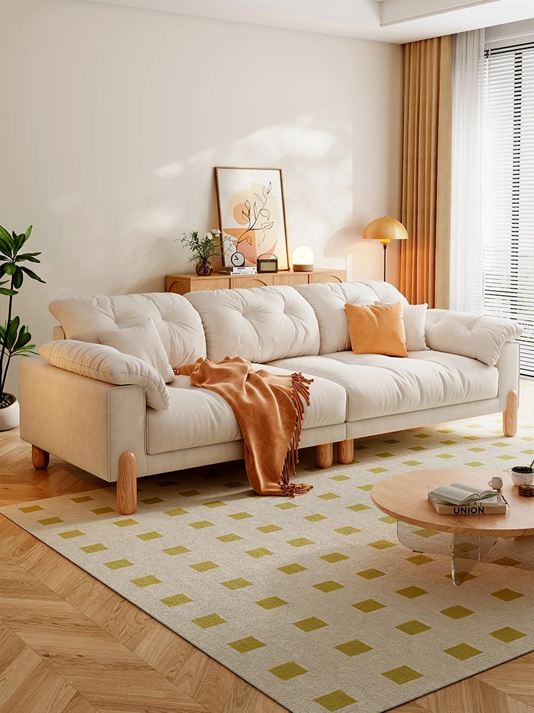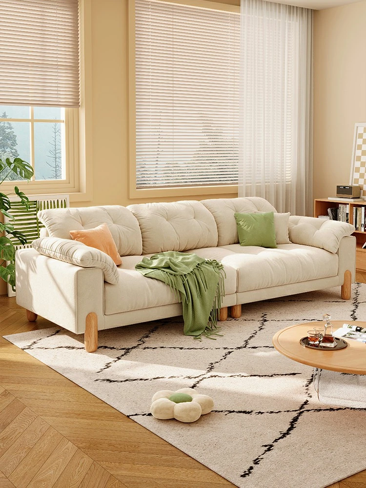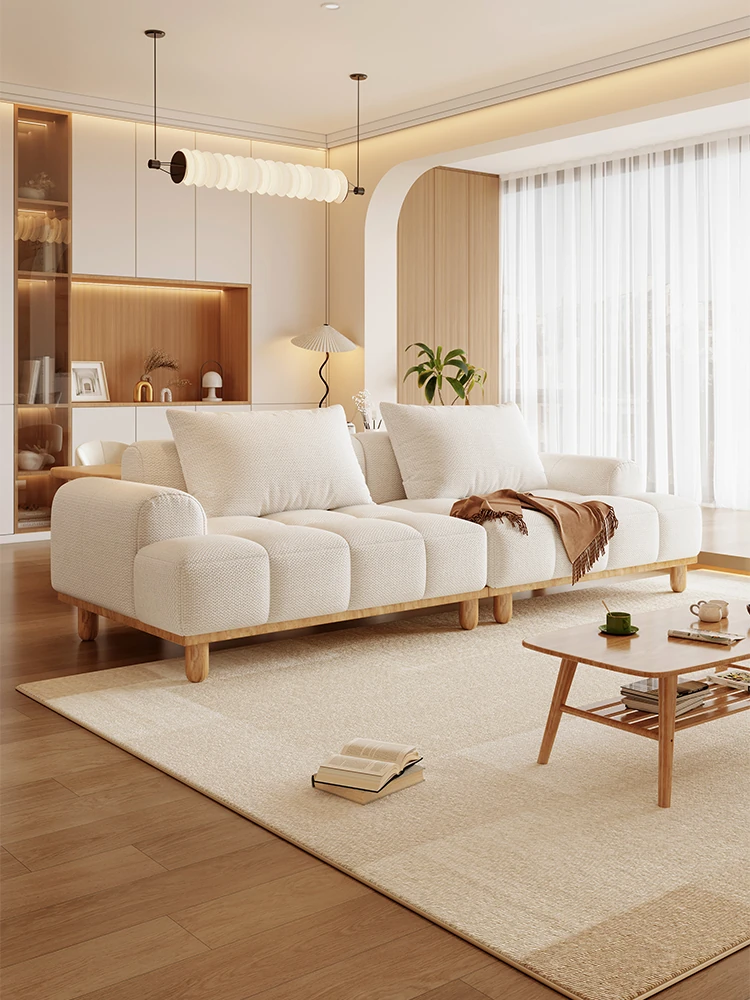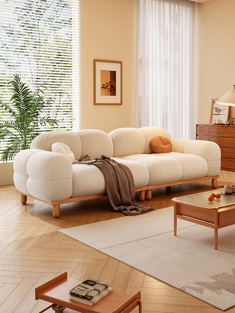 フランス風クリーム仕立てのウッド調シュークリームソファ - モダンでシンプルなリビングや民宿、小型住宅に最適な雲のようなデザインの無垢材ソファです。快適さとスタイルを兼ね備えた一品をお楽しみください!