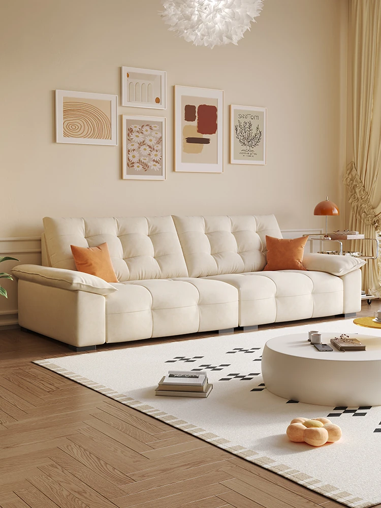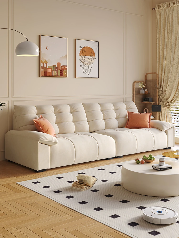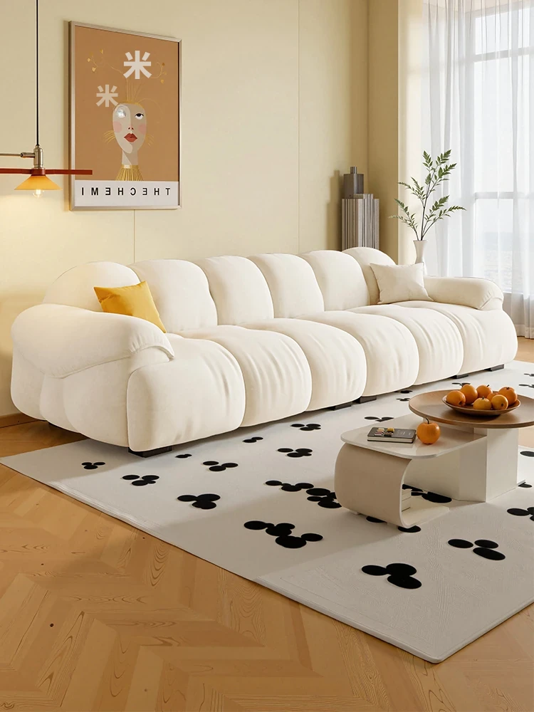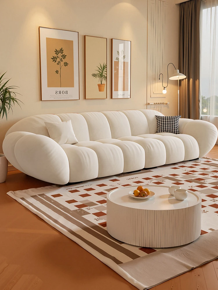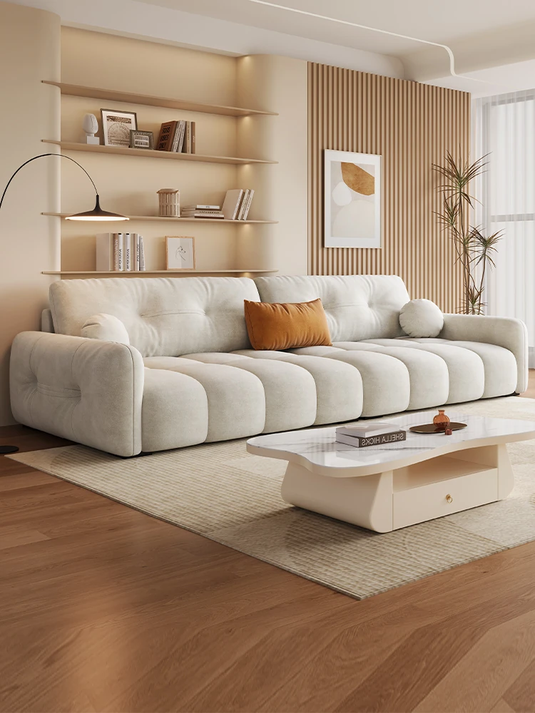 クリーミーなインスタ風雲朵パフ猫抓布製ソファ、モダンでシンプルなリビングやアパート、民宿にぴったり!ふわふわのマシュマロのような触り心地で、くつろぎの空間を演出します。