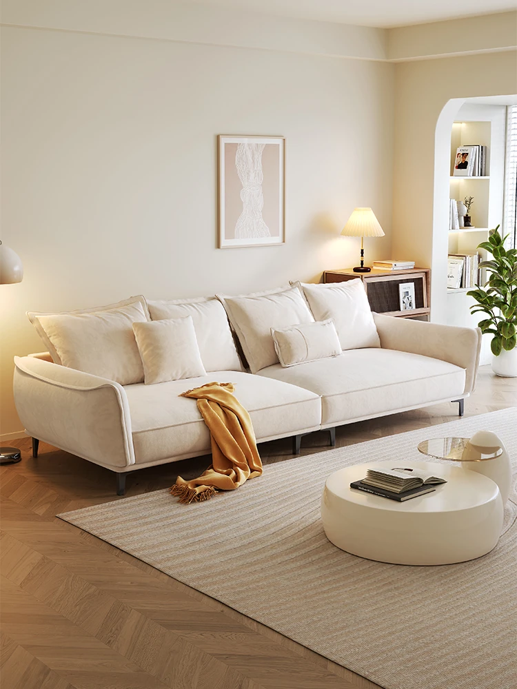 新作クリーム風フレンチベルベットソファ|モダンでシンプルなデザイン|ダウンとラテックスの直置きスタイル|小さなリビングにも最適!快適さとスタイルを両立した一品です。