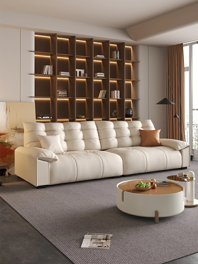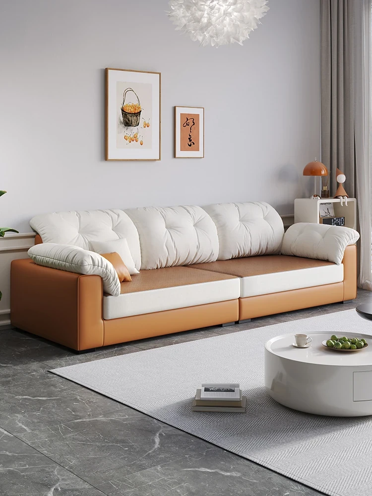 フレンチヴィンテージ風オイルワックスレザー雲朵ソファ|小型リビングに最適なシンプルでおしゃれな中古風家庭用直線デザインソファ!心地よい座り心地とスタイリッシュな雰囲気をお楽しみください。